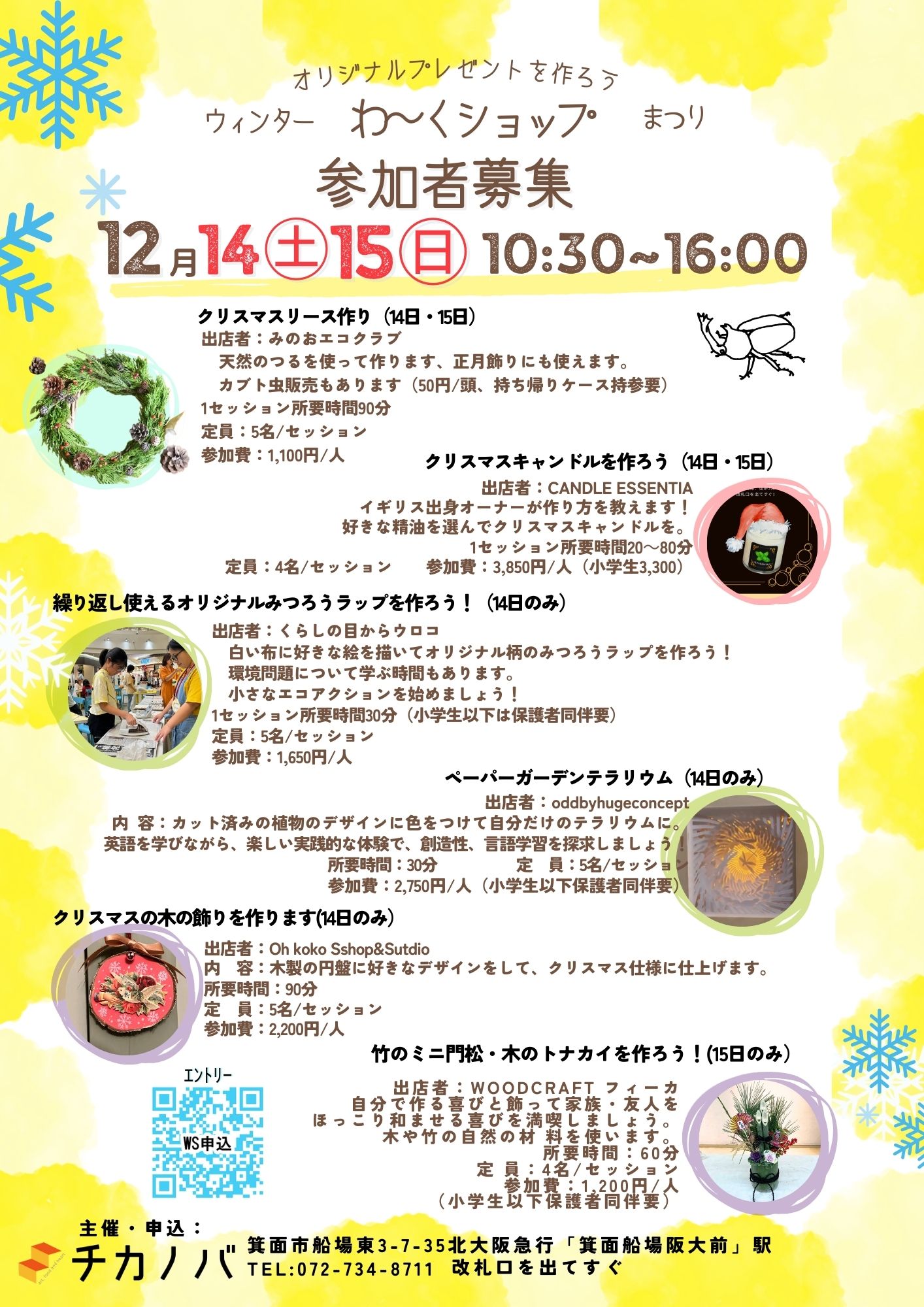 内容…クリスマスリースやキャンドルなどのワークショップ、雑貨、野菜などの販売ほか ※ワークショップは申込フォームから要申込。 定員(申込順)はワークショップにより異なります ワークショップでオリジナルプレゼントを作りませんか? クリスマスリースを作ろう 天然のつるを使って作ります、正月飾りにも使えます。 (カブト虫販売もあります。50円/頭。持ち帰りケース持参要) 参加費:1,100円 所要時間:約90分/セッション 定員:5名/セッション 持ち物:なし 実施団体:みのおエコクラブ クリスマスキャンドルを作ろう ご自分で精油を選び、クリスマスをテーマにしたキャンドルを作って大切な人に贈りましょう。 イギリス出身オーナーが作り方を教えます! 参加費:<大人>3,850円 <キッズ>3,300円 *10歳以下の方は保護者同伴が必須となります。 所要時間:約20 〜80分/セッション 定員:4名(2人・2組)/セッション <キッズ、大人ショートバージョン> *ショートバージョンでも大人の参加費は変わりません。 所要時間:約20分 用意されたキャンドルへのデコレーション等を行います。 <大人フルバージョン> 所要時間:約80分 お好みの精油や色を選びキャンドルを作ります。 約40分乾燥させ、その後デコレーション等を行います。 乾燥中は他のワークショップへ参加したりカフェでくつろいだり、ご自由にお過ごしください。 持ち物:なし 実施団体:CANDLE ESSENTIA 繰り返し使えるオリジナルみつろうラップを作ろう!(12/14のみ) 白い布に好きな絵を描いてオリジナル柄のみつろうラップを作ろう!環境問題について学ぶ時間もあります。 小さなエコアクションを始めましょう! 参加費:1,650円 所要時間:約40分/セッション 定員:5名/セッション *アイロンを使用するので小学生以下は保護者同伴でお願いします。 持ち物:なし 実施団体:くらしの目からウロコ ペーパーガーデンテラリウム:ミニチュアワールドのクラフト(12/14のみ) 英語を学びながら、切り絵でアートや工芸品を作りましょう。子供にも大人にも最適です。 内容:. 好きなカット済みの植物のデザインを選択⇒ 植物に色をつける⇒ ガラスドームの中に植物を配置⇒自分だけのテラリウムを完成。 楽しい実践的な体験で、アート、創造性、言語学習を探求しましょう。 参加費:2,750円 所要時間:約30分 定員:2名/回 *ハサミなどの刃物を使用するので小学生以下は保護者同伴でお願いします。 実施団体:oddbyhugeconcept クリスマスの木の飾りを作ります(12/14のみ) 内容:. 木製の円盤に好きなデザインをして、クリスマス仕様に仕上げます。 参加費:2,200円 所要時間:約90分 定員:5名/回 実施団体:oh koko Shop&Sutdio 木のトナカイでクリスマス、竹のミニ門松でお正月を迎えましょう!(12/15のみ) 木・竹の自然の材料でクリスマス・お正月を祝いましょう。 参加費:1,200円 所要時間:約60分 定員:4名/回 *未就学児は参加できません。小学生は必ず保護者様同伴、中学生以上はお一人でも参加可能です。 持ち物:軍手、作品の持ち帰り用紙袋 実施団体:Woodcraft フィーカ *状況により、ワークショップの内容が変更となったり開始時間が前後する場合があります。あらかじめご了承ください。 ☆野菜や雑貨などの販売もあります。 |